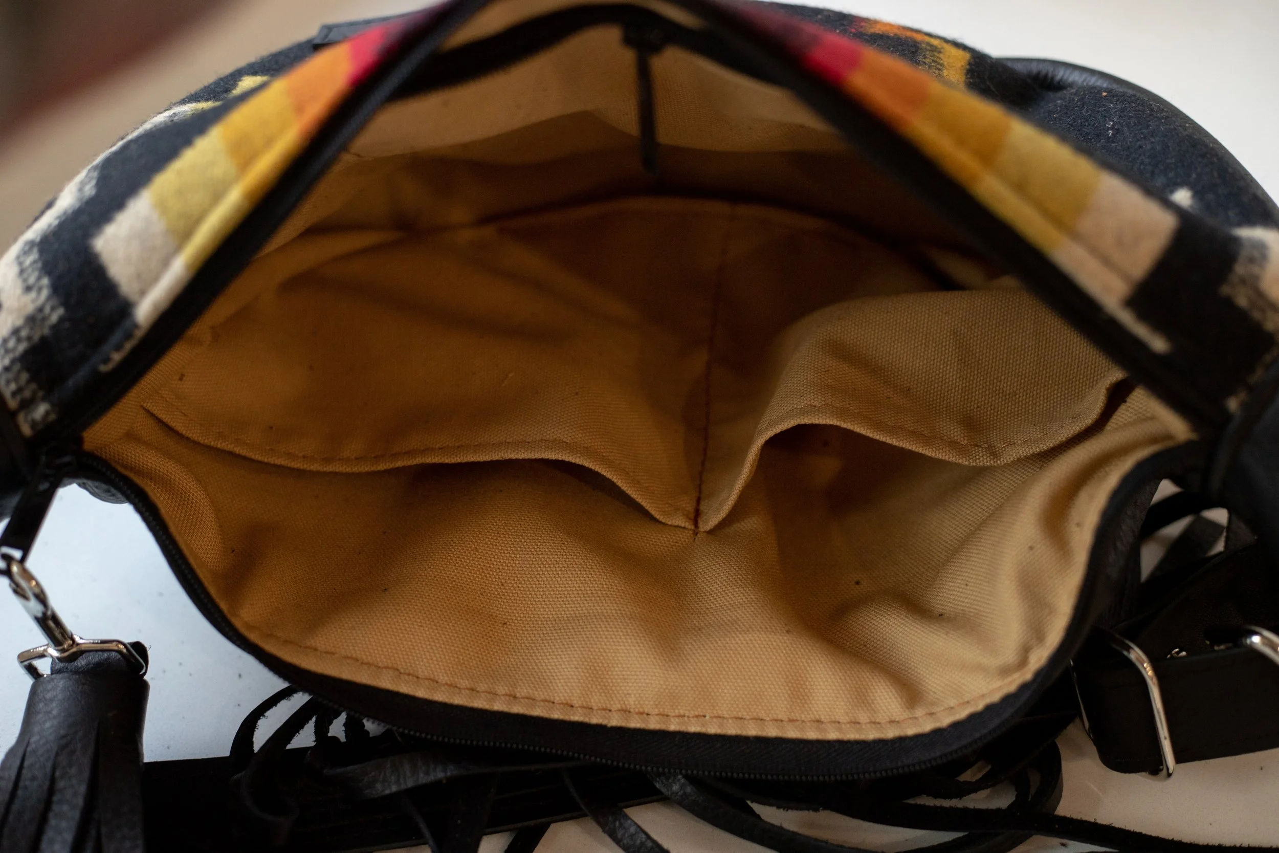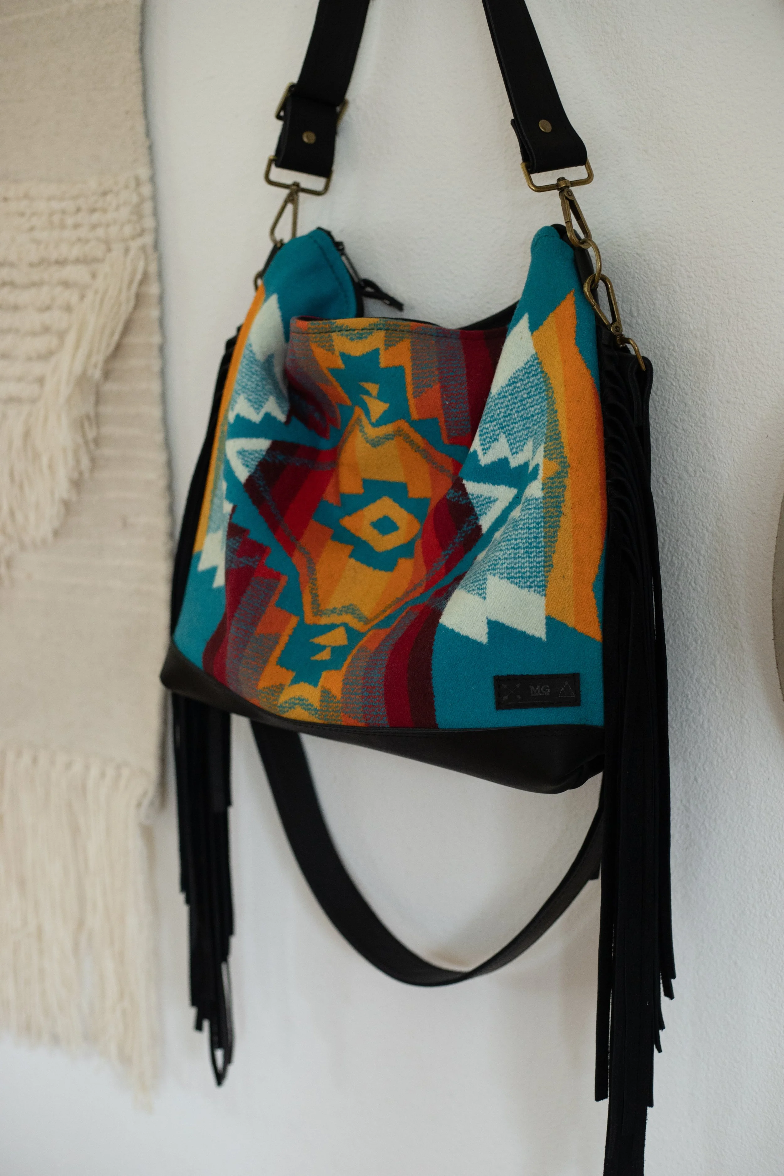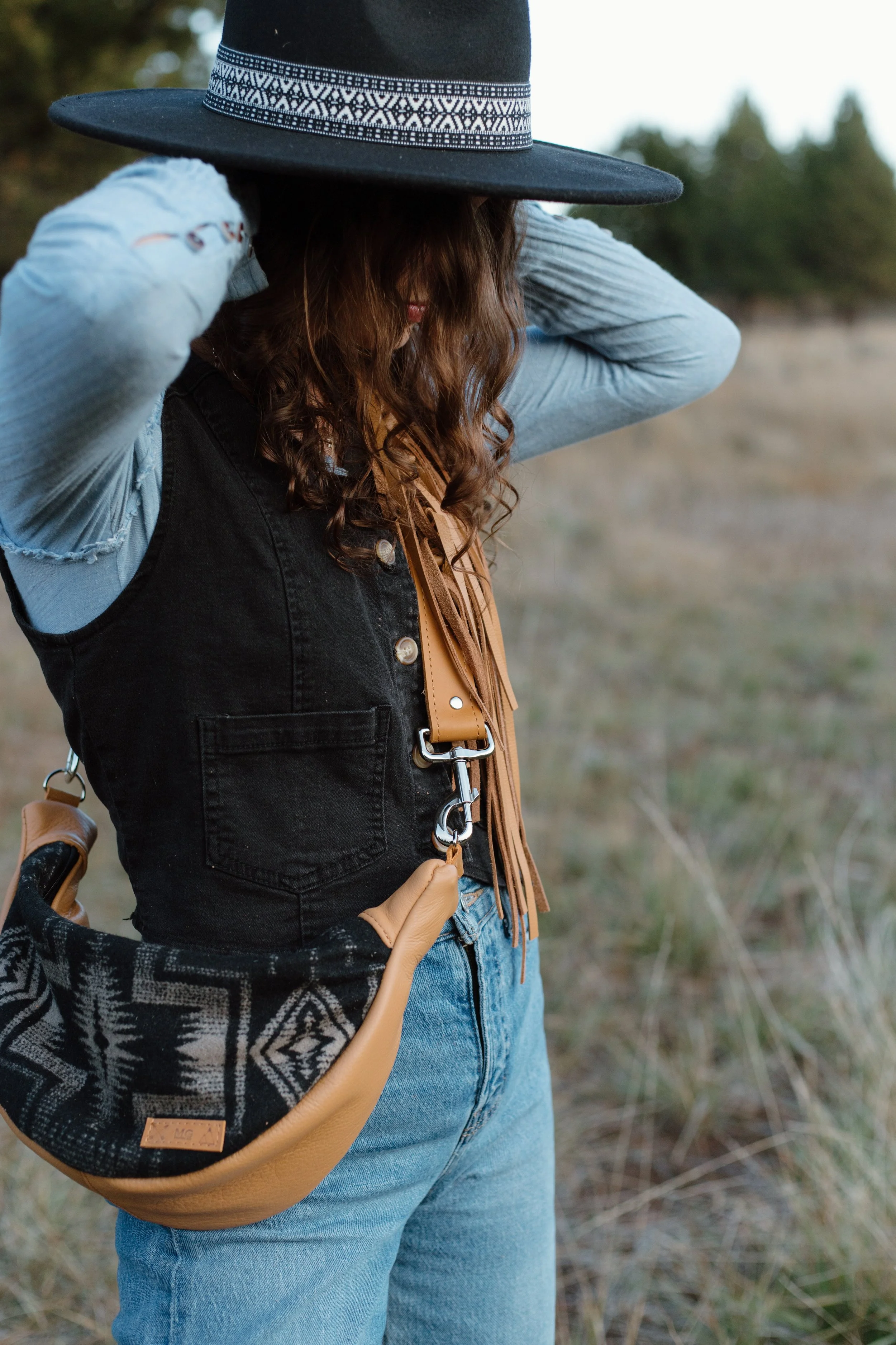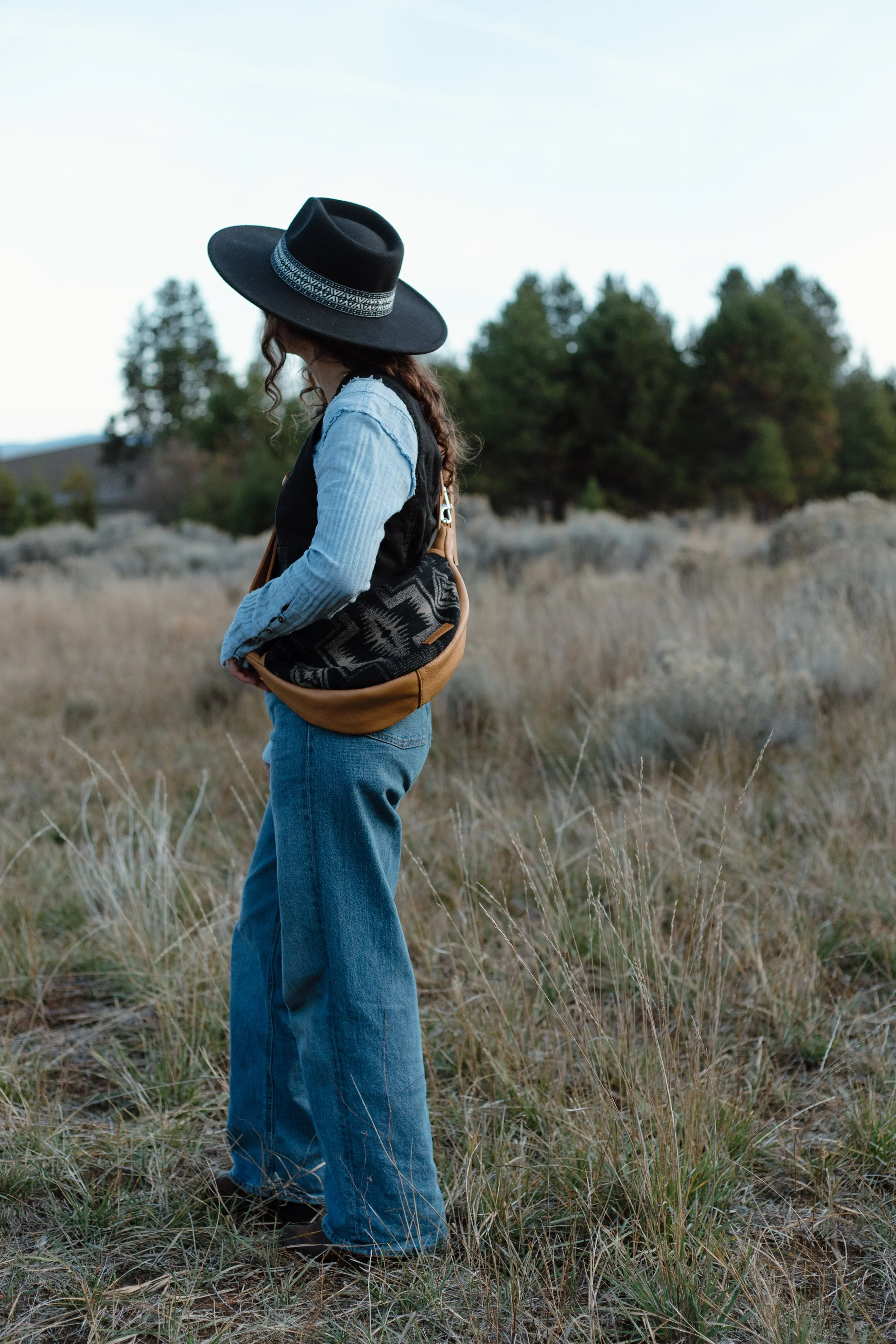 woman wearing southwestern style bag handmade with Pendleton wool and leather in Oregon