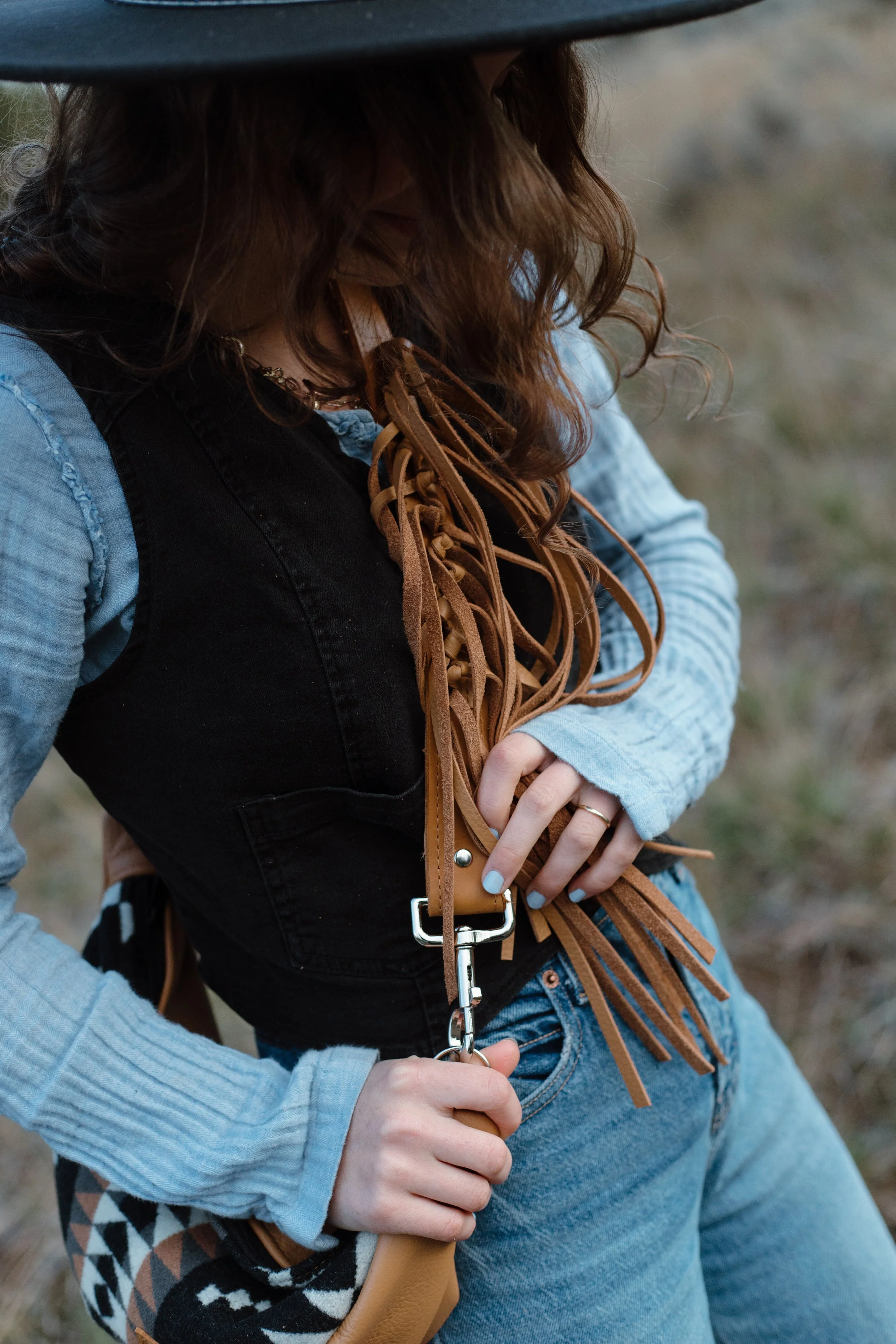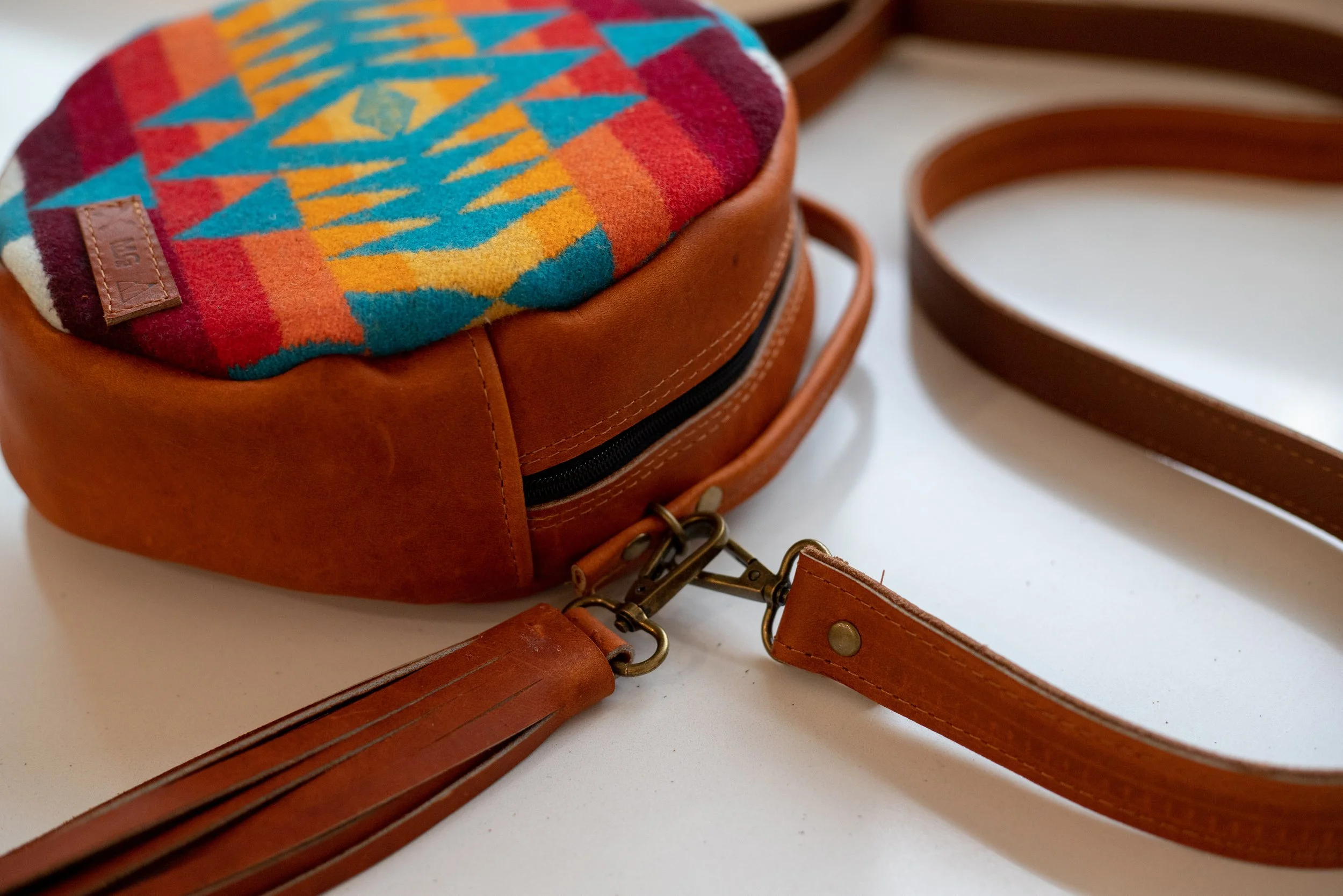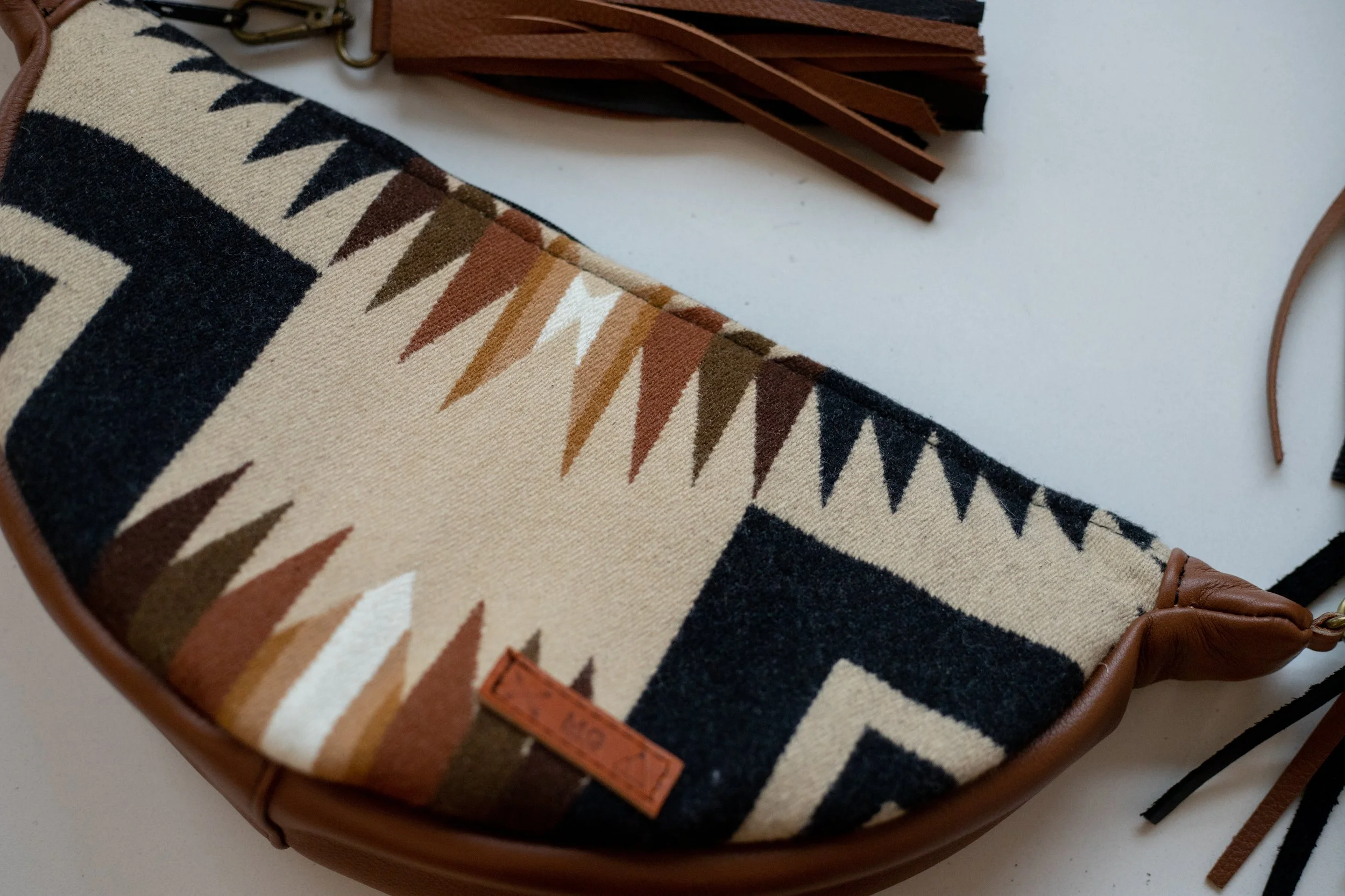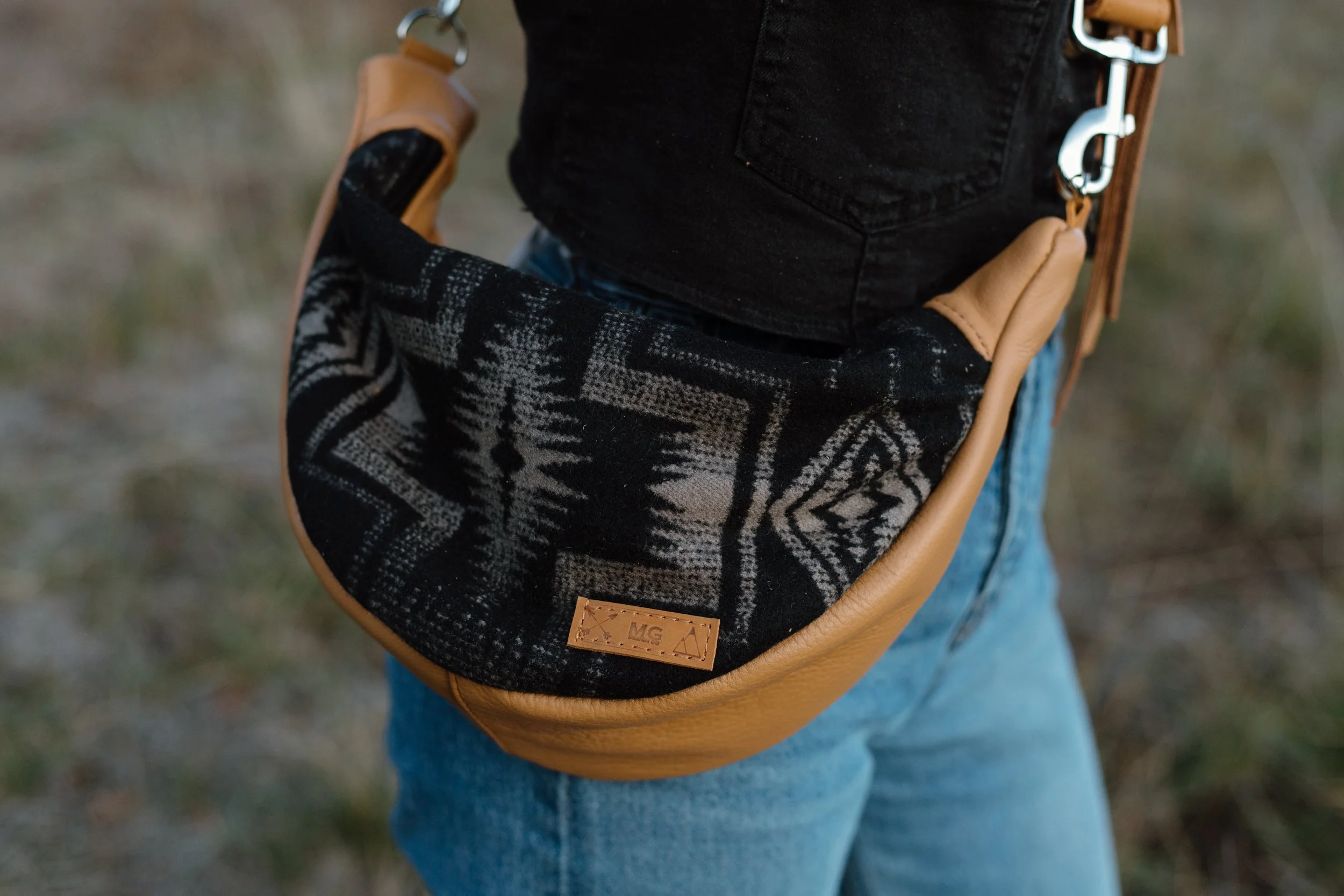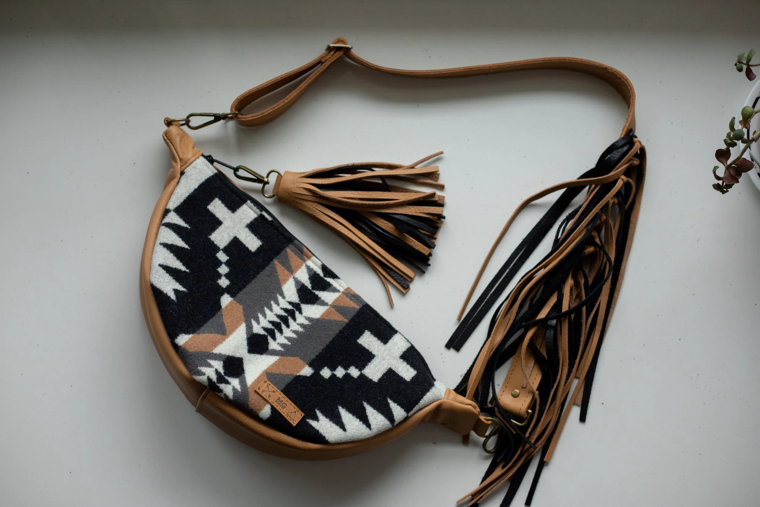 woman wearing southwestern style bag handmade with Pendleton wool and leather in Oregon