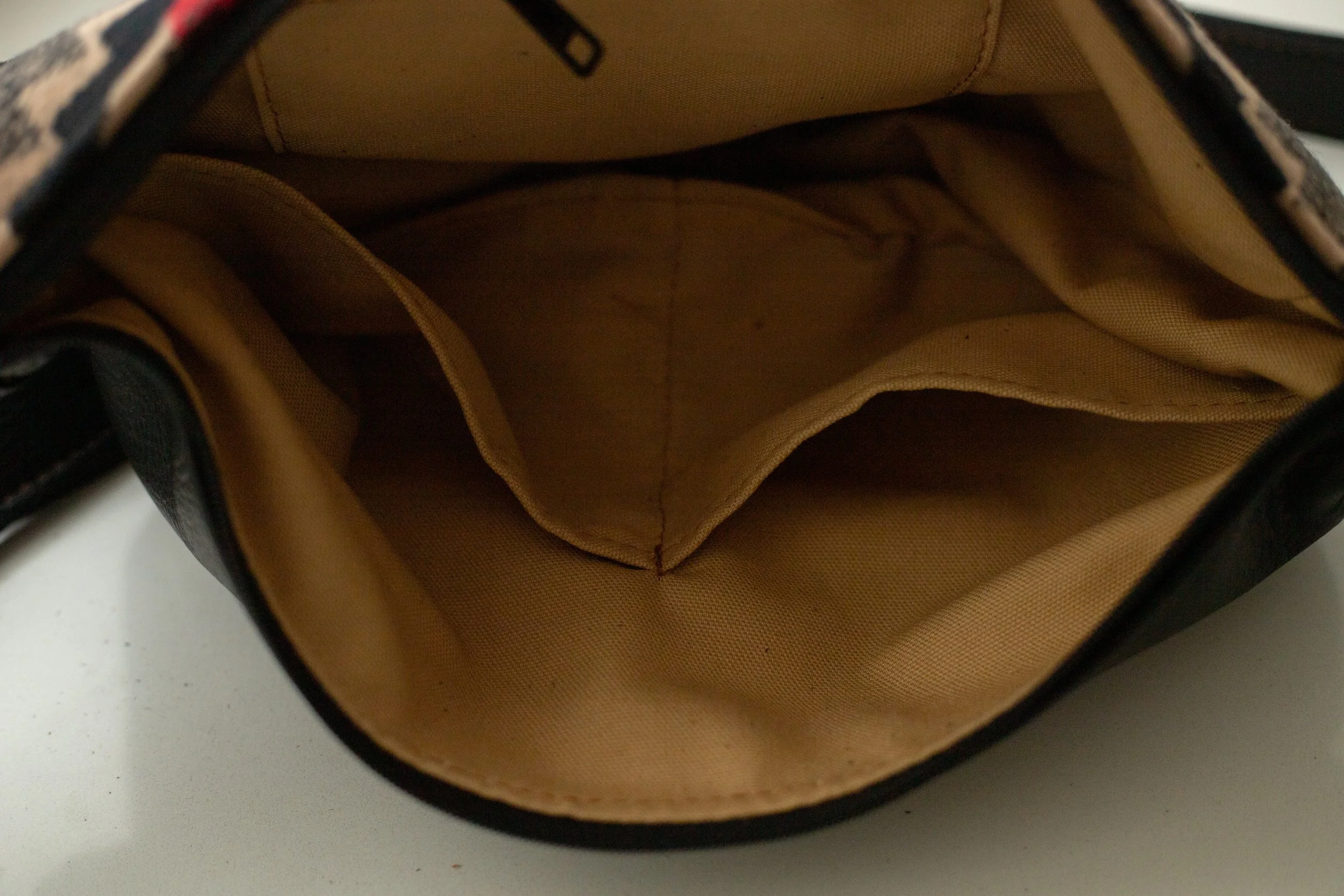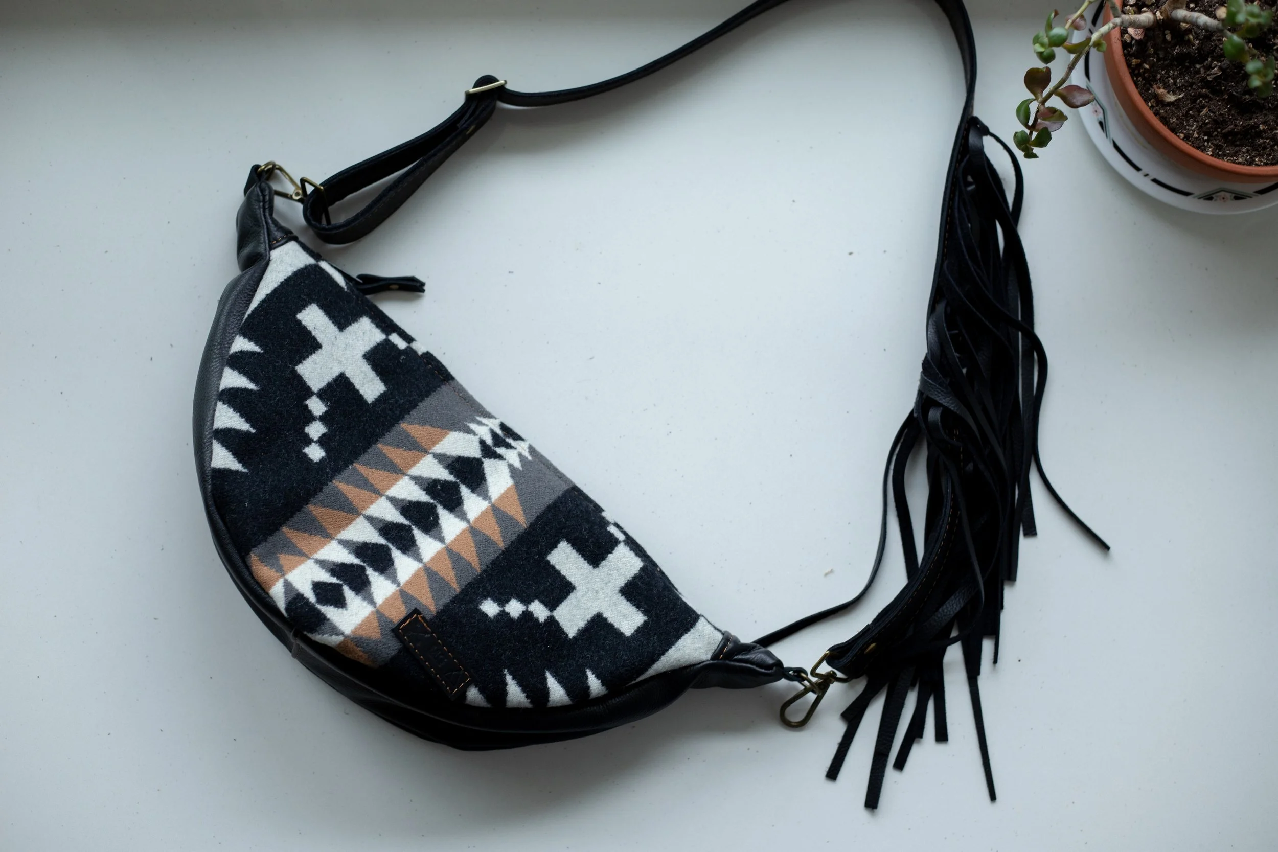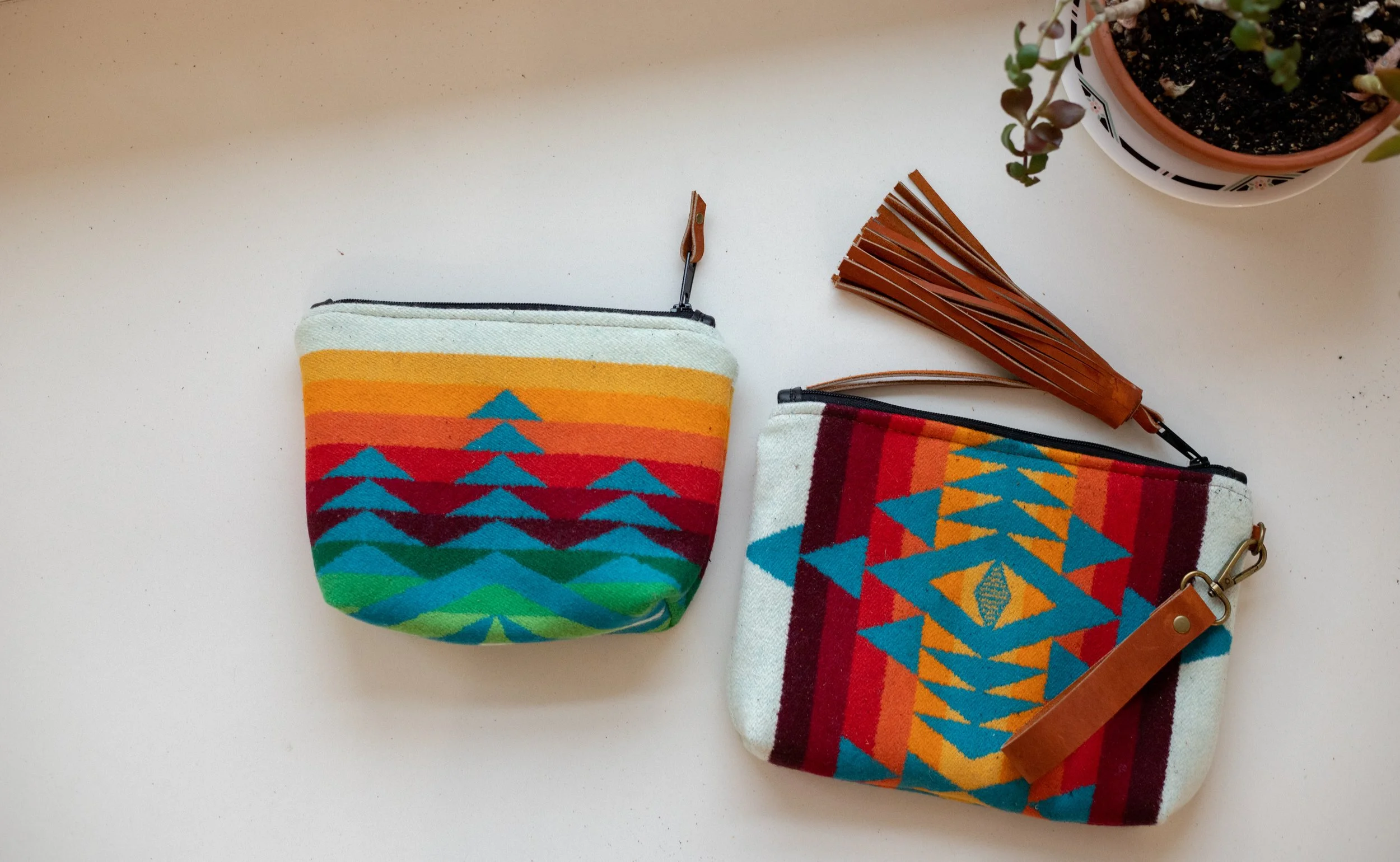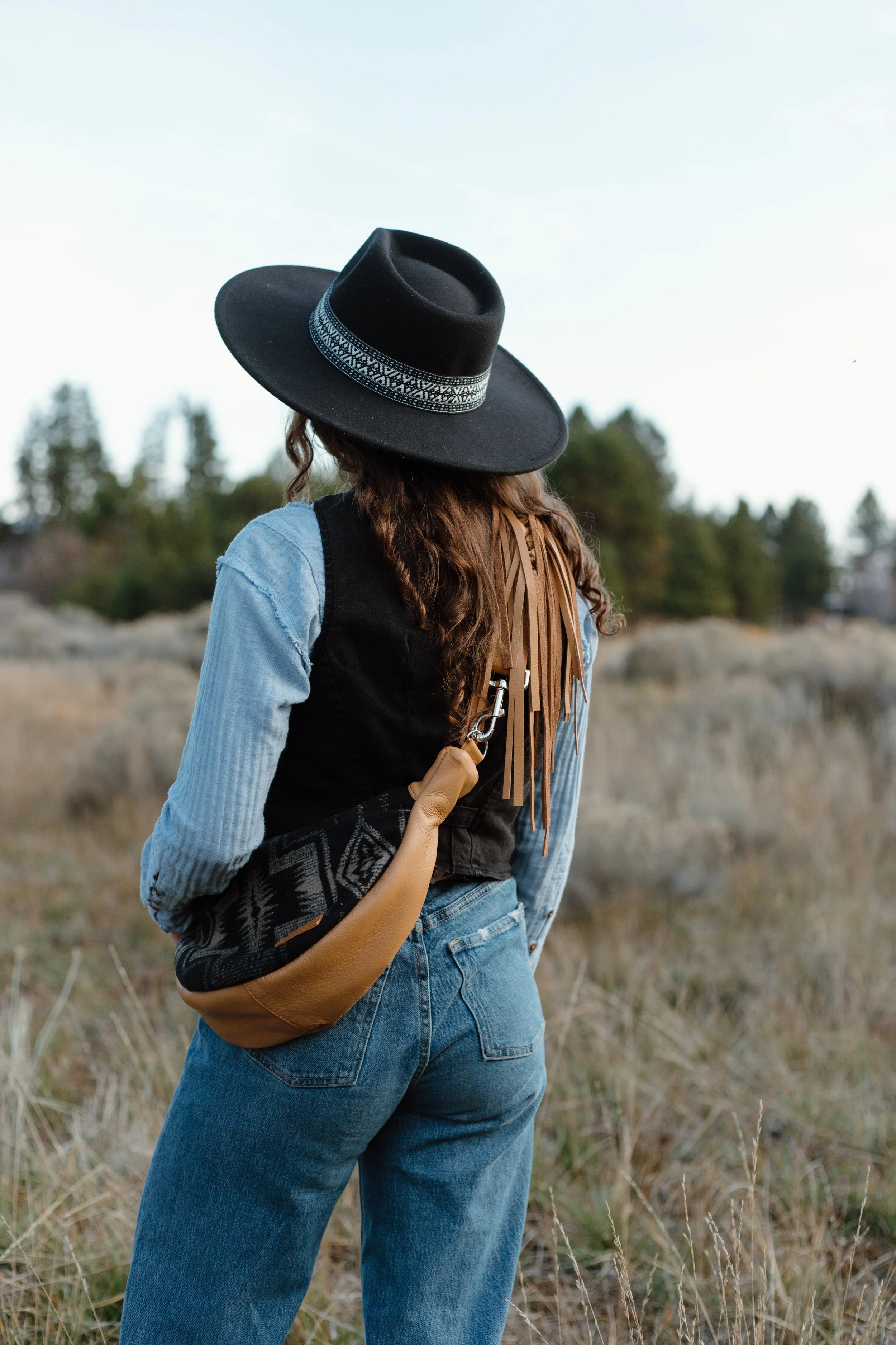 woman wearing southwestern style bag handmade with Pendleton wool and leather in Oregon